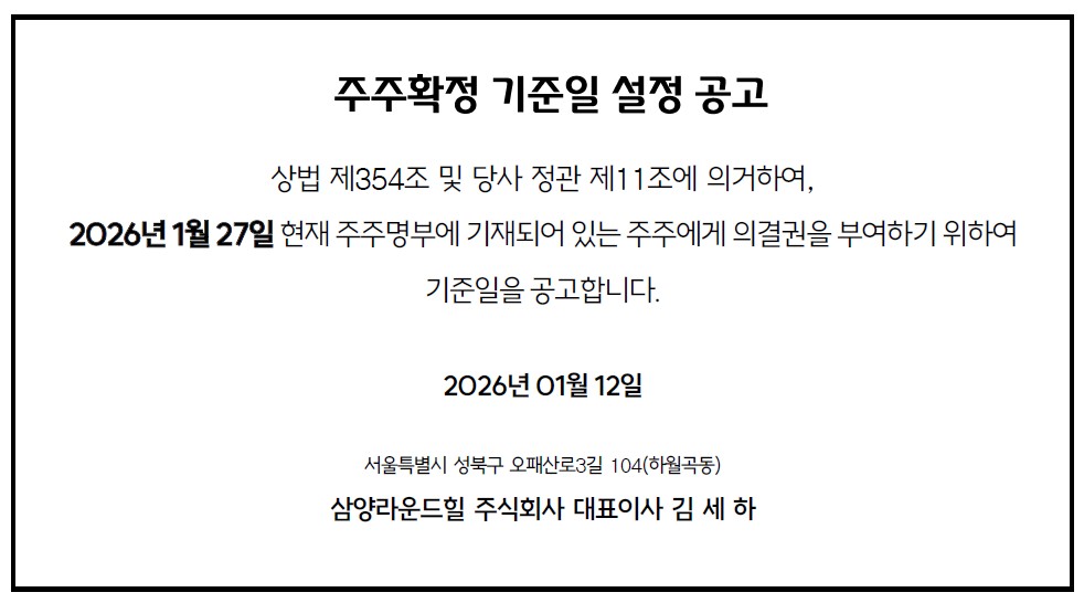 주주확정 기준일 공고 2026-01-09 페이스북 주주확정 기준일 공고 이전글 2026년 신년 해맞이 이벤트 다음글 [삼양라운드힐X평창군 유기동물보호소] 평생 가족을 찾습니다! 목록